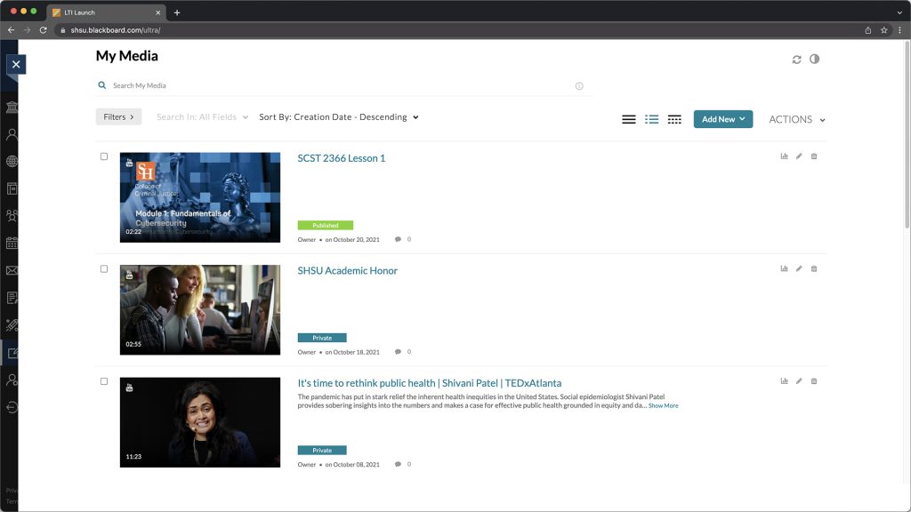 Most instructors use a mix of videos they self-produce and videos that SHSU Online helps them create. If you use SHSU Online’s lecture capture or video production services, you will receive and place the video in your course through Kaltura. Managing your videos is easier when all your videos are in the same place, so we also recommend that you upload any self-produced videos to Kaltura as well.