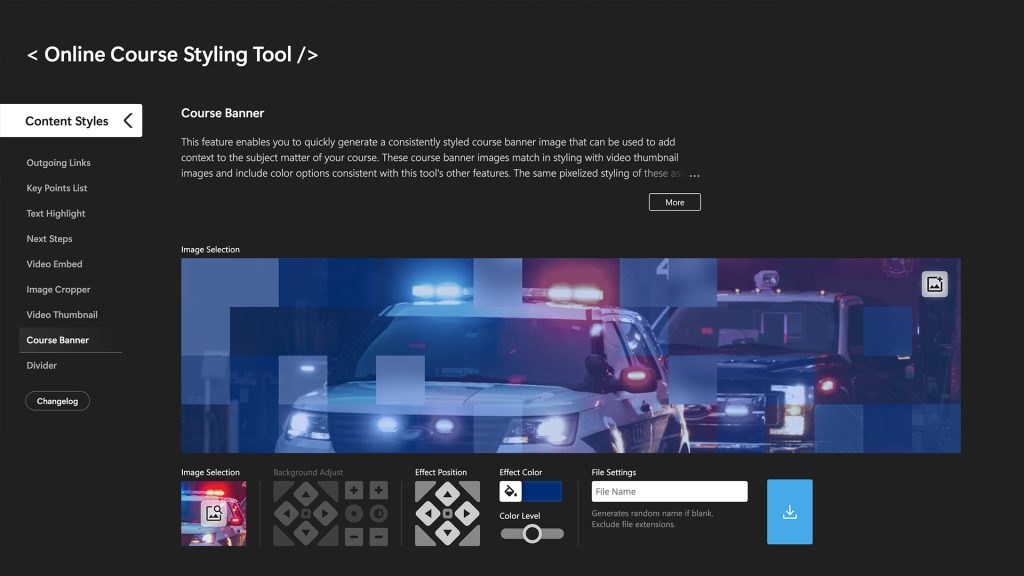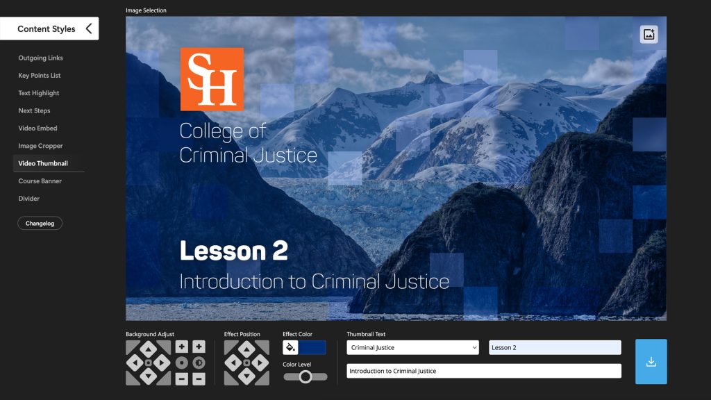 Implementing cohesive thumbnails or “poster images” for the videos in your course is small touch that can add context and continuity to instructional content. To make creating these assets quick and simple the Online Course Styling Tool now includes a video thumbnail creation feature. Thumbnail images created with this feature also have the benefit of visual consistency with course banners and other text styling that can be created with the tool.