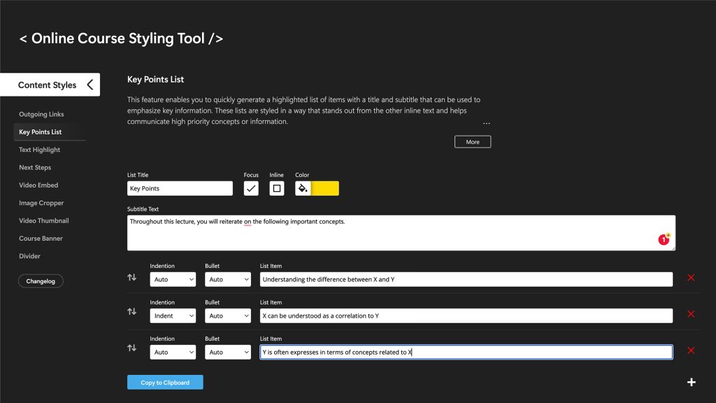 Delivering courses in an online format puts a spotlight on instructional content. From videos and graphics down to the text itself there are many opportunities to enhance the look and feel of instructional content and strengthen the delivery of course concepts. To help you get the most out of your course content the Media Innovation team has developed a web-based application we call the Online Course Styling Tool.